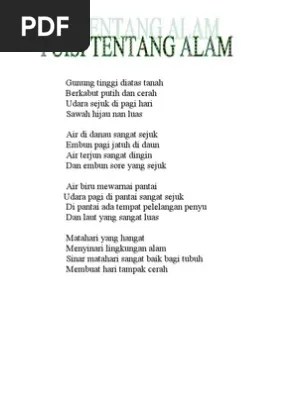 Contoh puisi pendek tentang alam · 1. Pesona alam hijau · 4. Puisi alam tema di seputar sungai. Contoh puisi tentang lingkungan alam yang singkat · menurut kbbi, puisi adalah ragam sastra yang bahasanya terikat oleh irama, matra, rima, serta .
